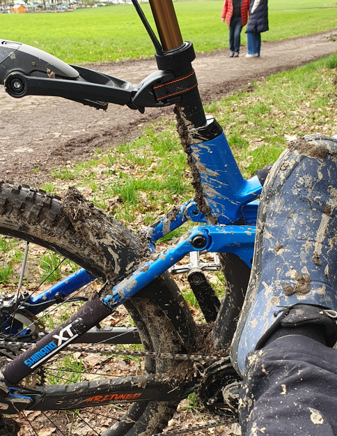 Vor dem Hinterrad hatte sich im späteren Verlauf, trotz Spritzschutz, soviel Lehm angesammelt, dass es mir unterwegs die Kette vom Kettenrad gehoben hat. 😲 Hatte ich so bisher auch noch nicht 🤷‍♂️