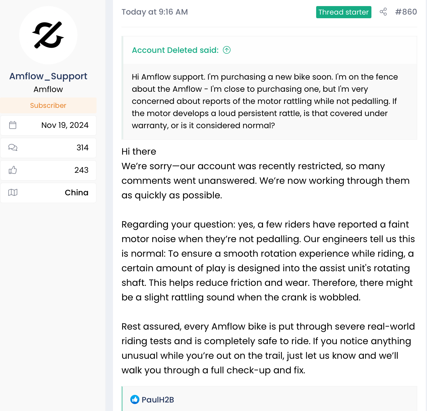 Offizielle Antwort des Supports zum Thema Motorengeräusche (Quelle grünes Forum).