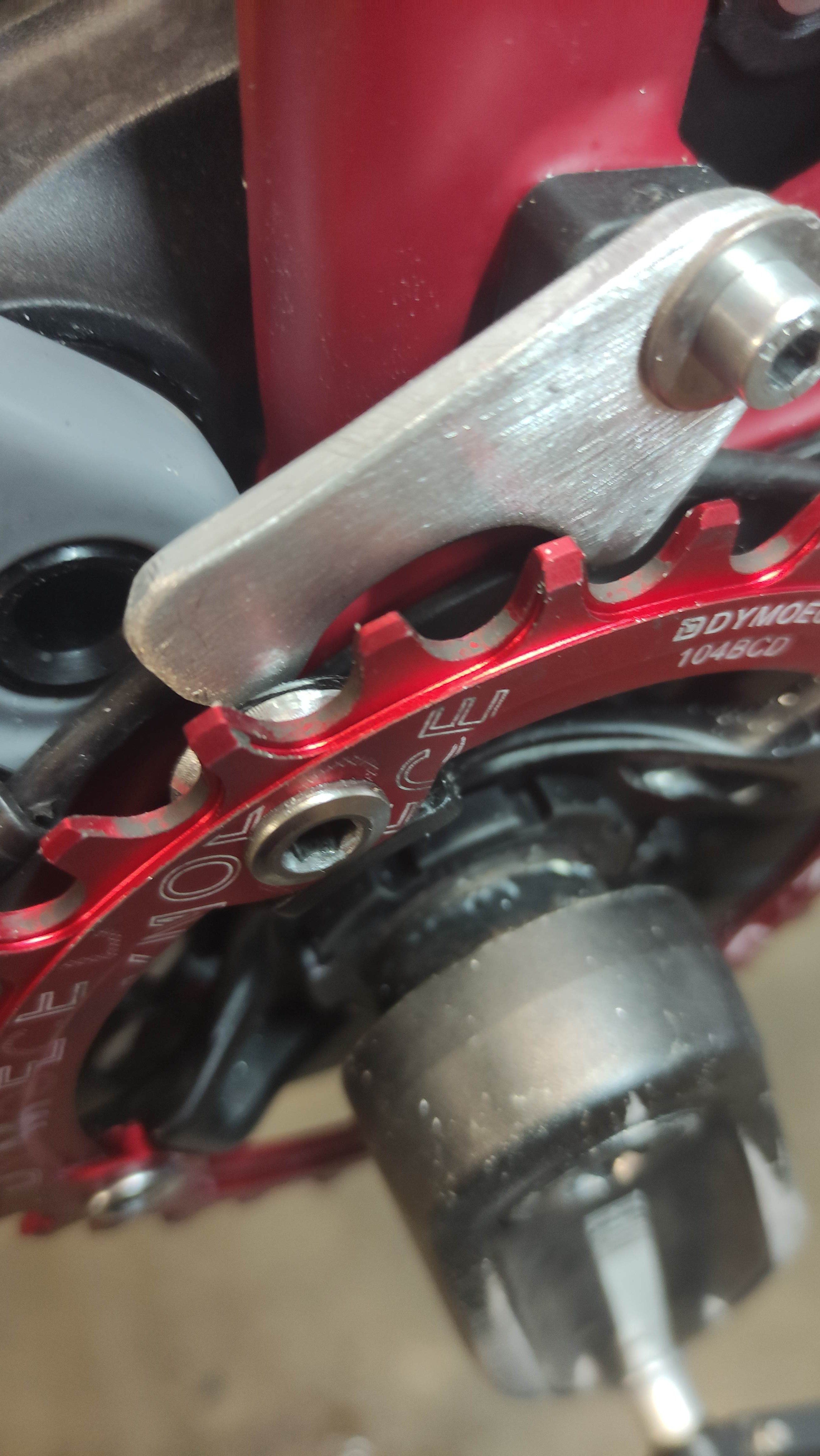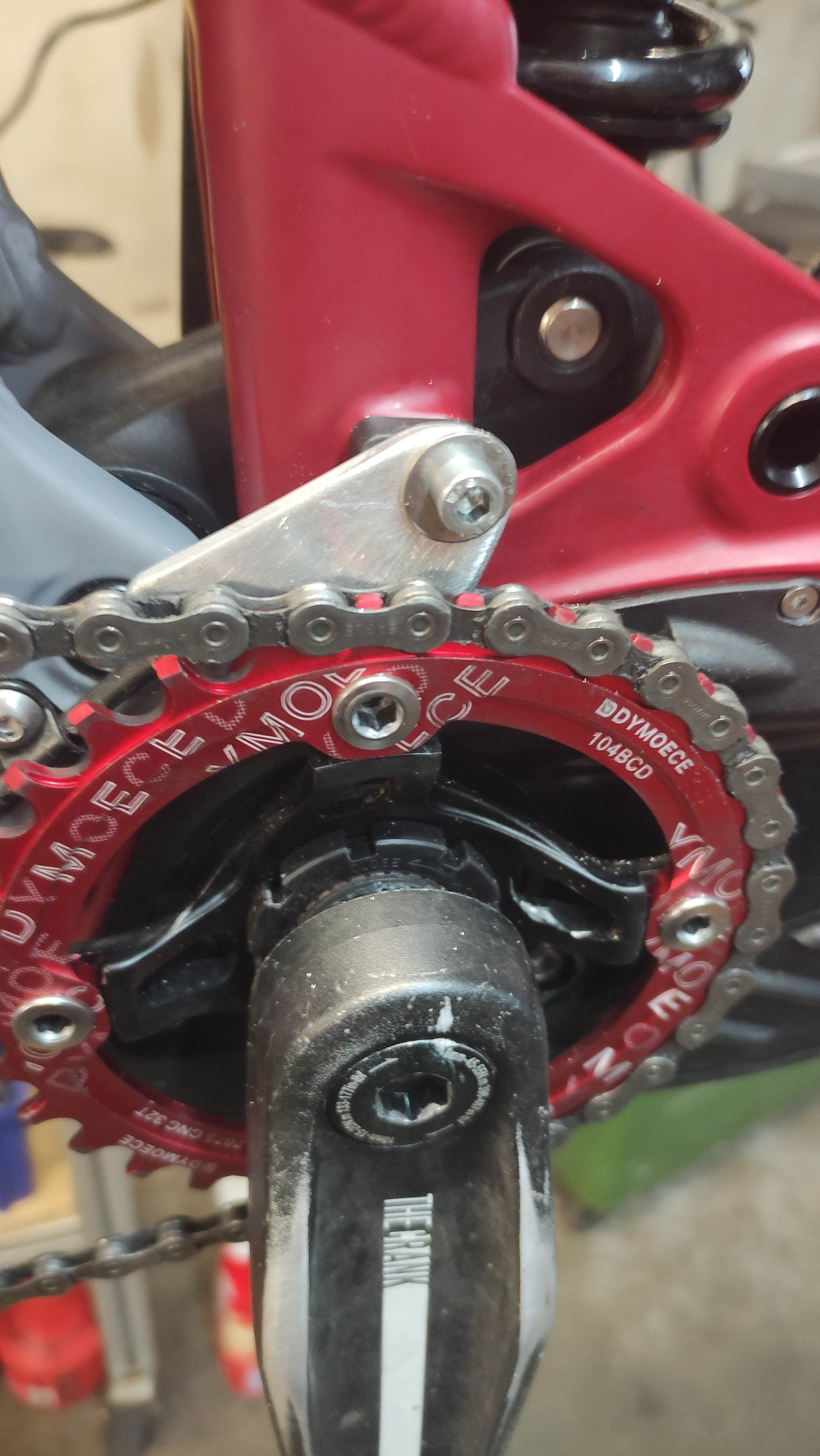 Auch die labile Kettenführung habe auch eine aus Alu ersetzt, erstmal für den Innenbereich um auch den Zug für die Sattelstütze zu schützen !, und die Kette fällt zu 99% nach innen runter